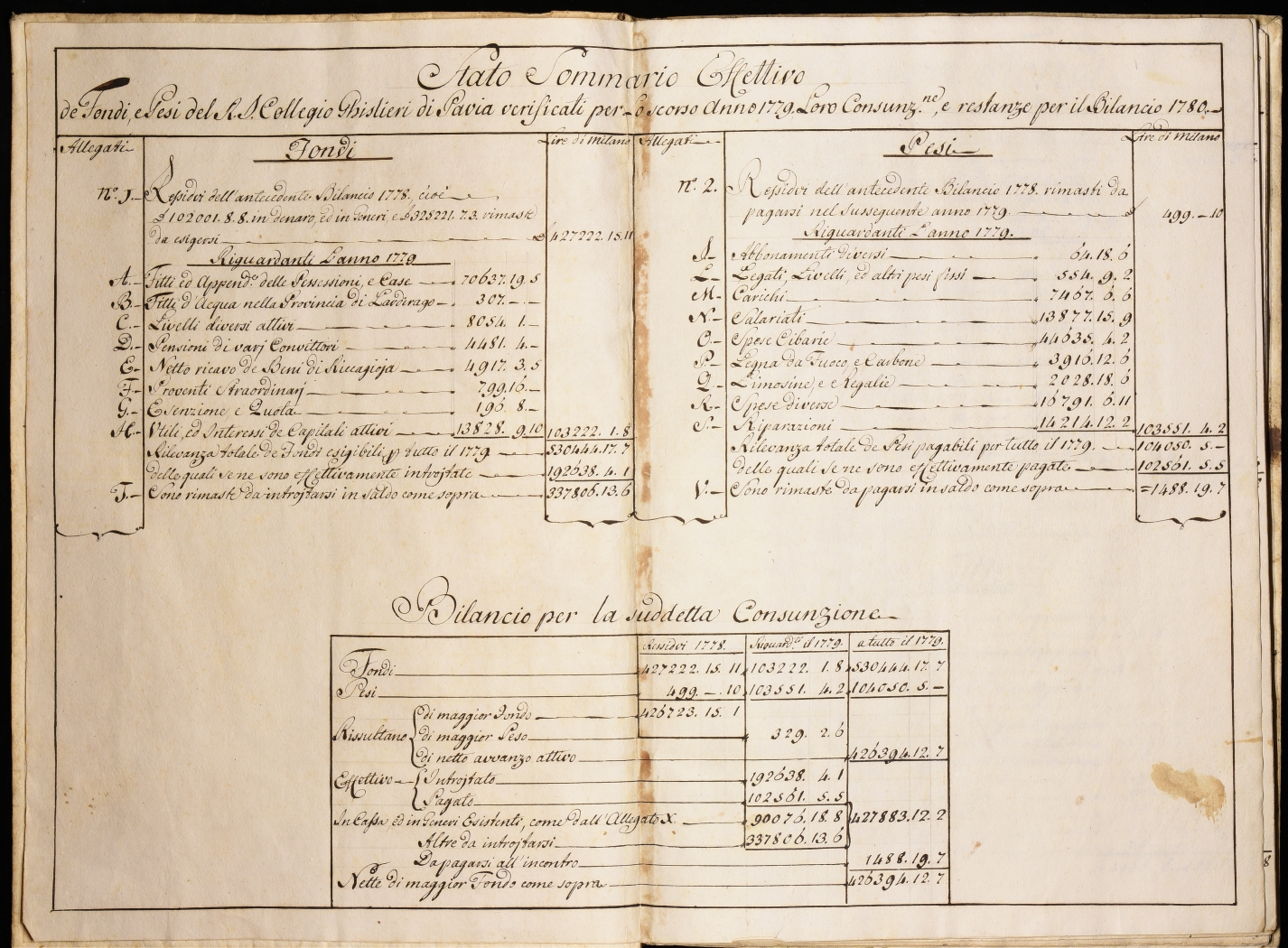 La parte più consistente del Fondo antico riguarda il patrimonio, a partire dagli atti relativi alla costruzione del palazzo del Ghislieri. Il materiale più interessante comprende la serie archivistica delle acque (Iura aquarum), la cui documentazione risale a prima della fondazione del Collegio, e le cartelle dedicate a terreni e possessioni agricole suddivisi per località , tra cui le proprietà a Gerenzago e Lardirago. La sezione si completa con documenti notarili e di natura finanziaria e con i verbali della Veneranda Congregazione del Collegio, gli atti relativi alla giurisdizione sulle persone e le cose, quelli di nomina degli alunni e quelli relativi al Catasto Teresiano, il Fondo Convitto nazionale poi Scuola Militare (1796 – 1813) e i legati da parte di privati. Nella parte otto e novecentesca spiccano la serie di atti amministrativi e la serie completa dei concorsi degli alunni.