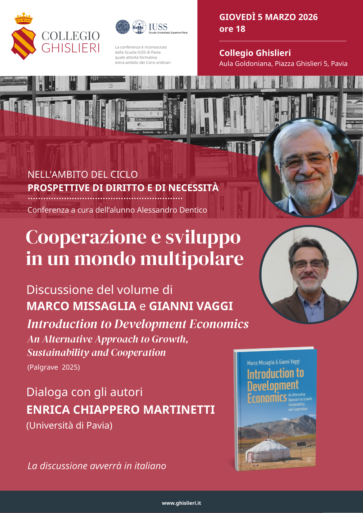 Il libro verrà presentato in Collegio giovedì 5 marzo (Aula Goldoniana, ore 18) nel quadro del ciclo Prospettive di diritto e di necessità. L’evento è promosso dall’alunno Alessandro Dentico. Con gli autori dialogherà Enrica Chiappero Martinetti (Università di Pavia), offrendo ai partecipanti l’opportunità di confrontarsi su temi centrali per l’economia globale e per il futuro delle politiche di cooperazione e sviluppo.