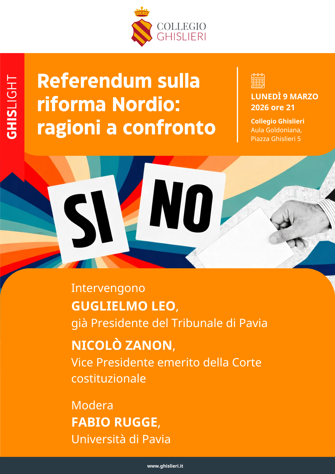 I temi sono complessi, è fondamentale essere informati. Per questa ragione il Collegio Ghislieri ha organizzato un dibattito pubblico aperto alla cittadinanza che si terrà lunedì 9 marzo alle 21 in Aula Goldoniana. Moderati da Fabio Rugge interverranno per il No Guglielmo Leo, già presidente del Tribunale di Pavia e per il Si Nicolo’ Zanon, già Giudice della Corte Costituzionale.