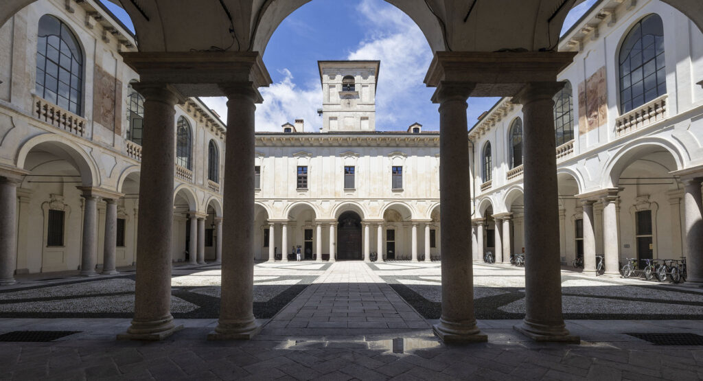 Elementi centrali del palazzo sono il suggestivo quadriportico al piano terreno, con il suo austero colonnato, e l’ampio e luminosissimo corridoio del primo piano (detto Quadrato), su cui si aprono le camere degli studenti.