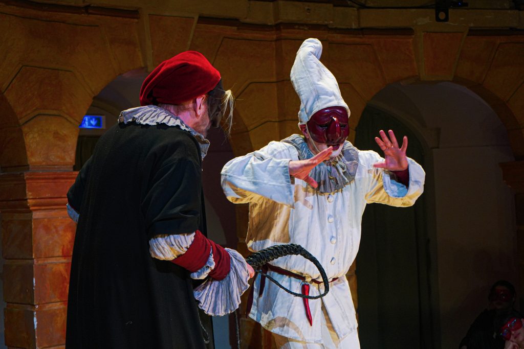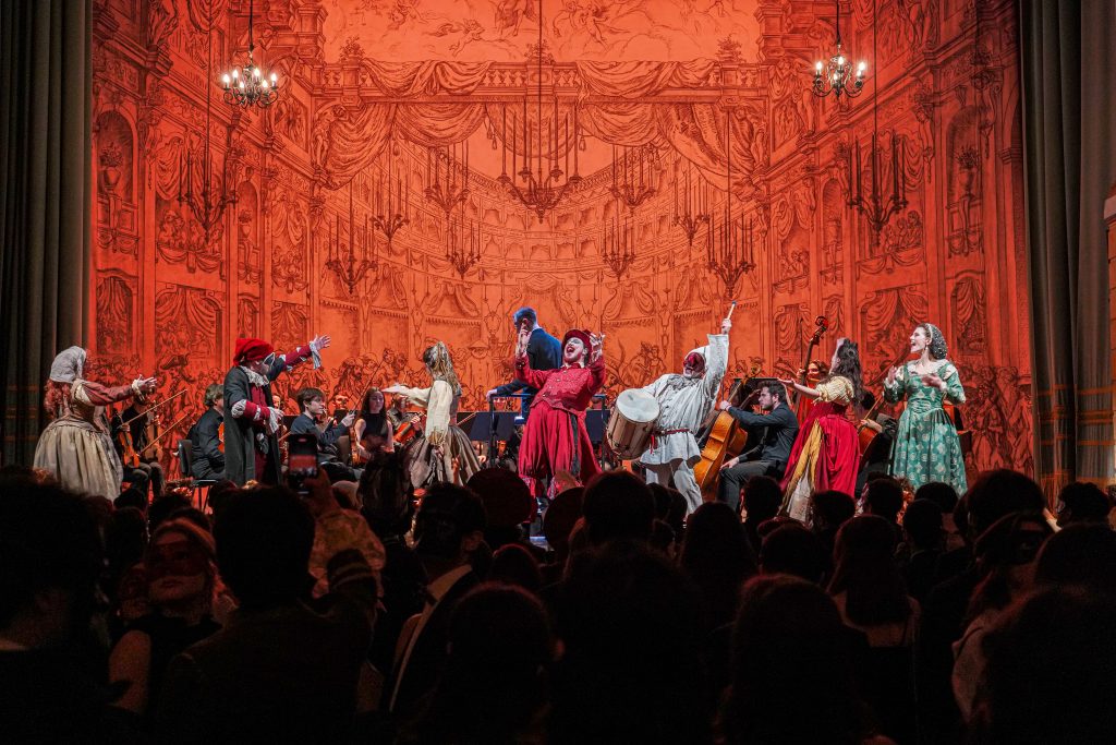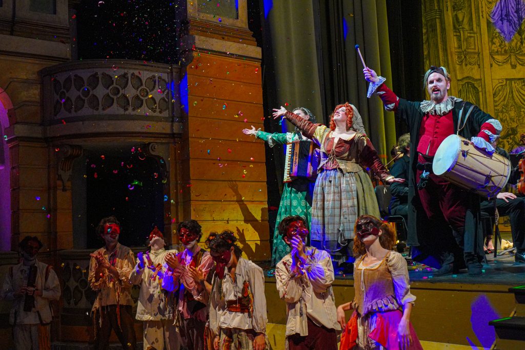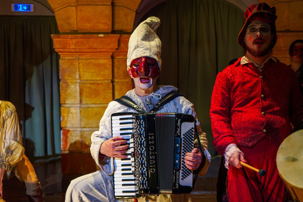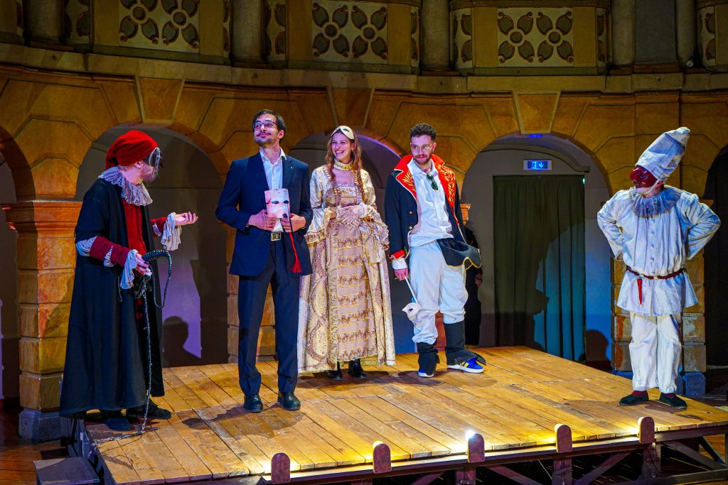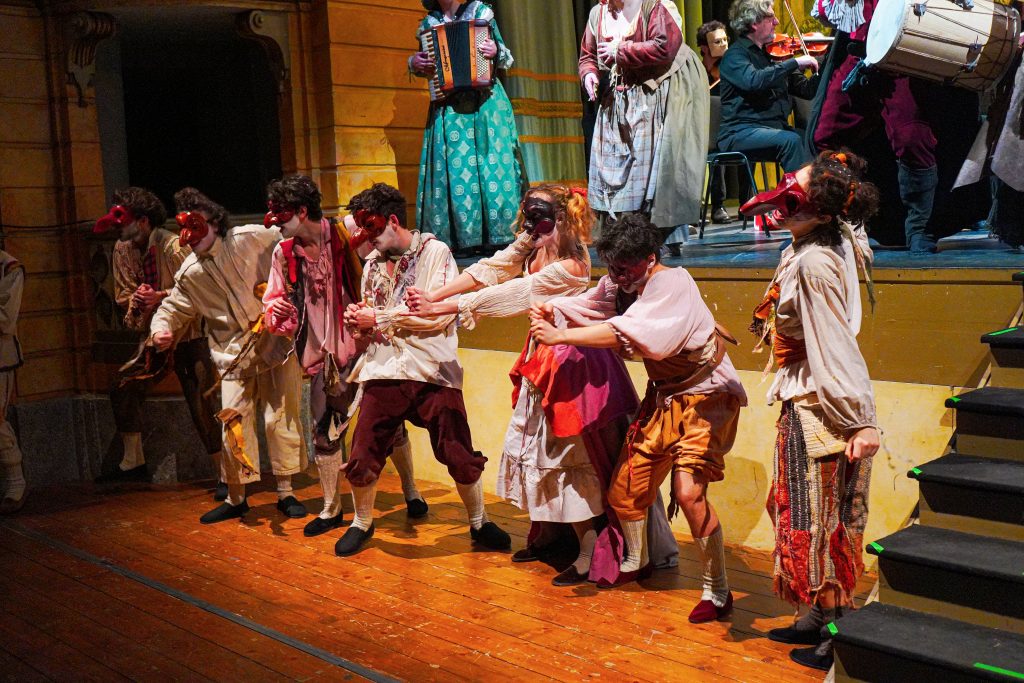 E alla fine Carnevale è stato festeggiato proprio alla maniera di Goldoni. Con le maschere dei guitti, i personaggi della Commedia dell’Arte, la strampalata ed effervescente vitalità di una rappresentazione, nata come omaggio al drammaturgo, che nella serata di martedì 4 marzo si è sviluppata tra il Collegio, le vie del centro e il Fraschini. Gli attori della compagnia Stivalaccio hanno fatto la parte del leone, istruendo sul teatro di strada un gruppo di universitari, ghisleriani soprattutto; la performance finale guidata dall’attore Pierdomenico Simone, un carosello di lazzi, canzoni, musica e danze, ha svegliato la città e l’ha invitata alla festa del Fraschini. Qui, nella platea liberata dalle poltrone e trasformata in un grande spazio, ha preso il via l’evento spettacolare che ha visto, ancora una volta, la straordinaria performance della compagnia Stivalaccio con le maschere della Commedia dell’Arte e le loro scenette, le pantomime, i canti e le danze con il pubblico mascherato e l’accompagnamento musicale delle neonata Orchestra Giovanile Pavese guidata da Giacomo Biagi.