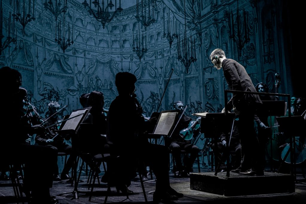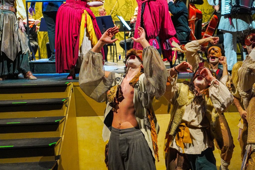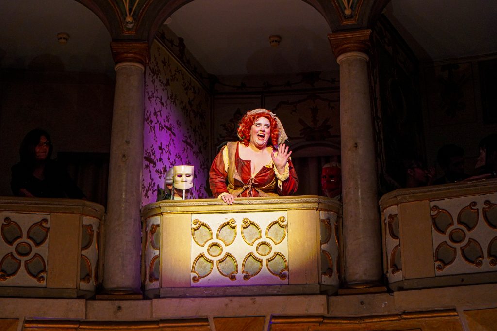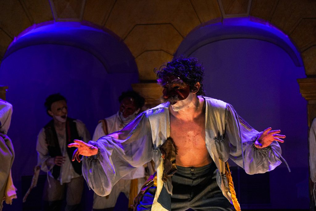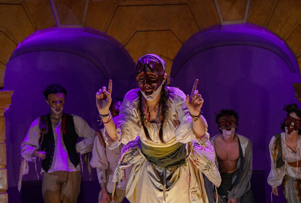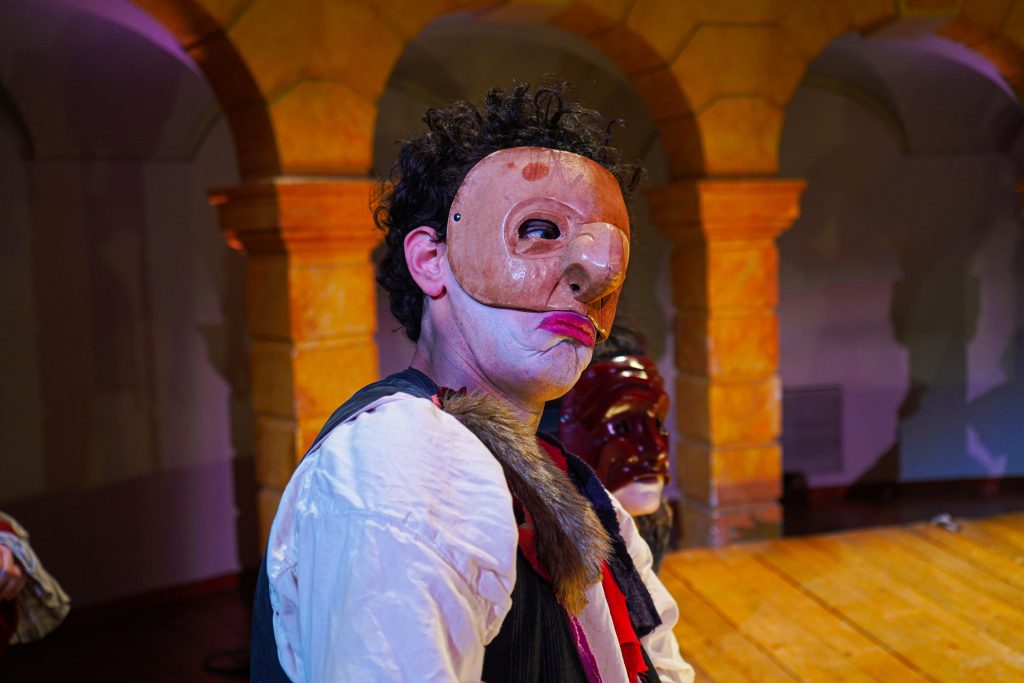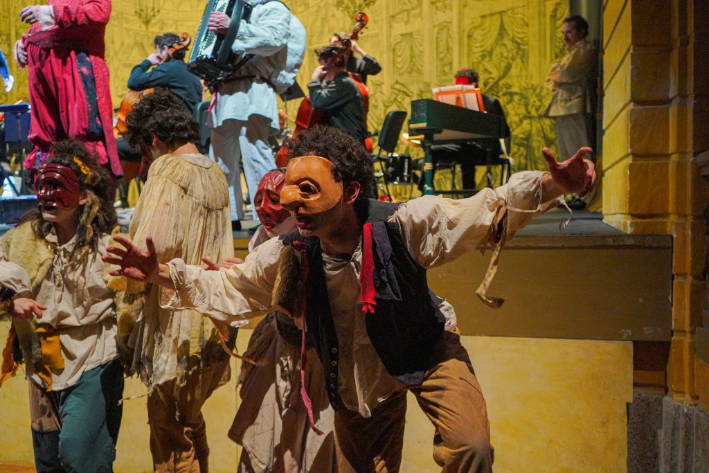 E alla fine Carnevale è stato festeggiato proprio alla maniera di Goldoni. Con le maschere dei guitti, i personaggi della Commedia dell’Arte, la strampalata ed effervescente vitalità di una rappresentazione, nata come omaggio al drammaturgo, che nella serata di martedì 4 marzo si è sviluppata tra il Collegio, le vie del centro e il Fraschini. Gli attori della compagnia Stivalaccio hanno fatto la parte del leone, istruendo sul teatro di strada un gruppo di universitari, ghisleriani soprattutto; la performance finale guidata dall’attore Pierdomenico Simone, un carosello di lazzi, canzoni, musica e danze, ha svegliato la città e l’ha invitata alla festa del Fraschini. Qui, nella platea liberata dalle poltrone e trasformata in un grande spazio, ha preso il via l’evento spettacolare che ha visto, ancora una volta, la straordinaria performance della compagnia Stivalaccio con le maschere della Commedia dell’Arte e le loro scenette, le pantomime, i canti e le danze con il pubblico mascherato e l’accompagnamento musicale delle neonata Orchestra Giovanile Pavese guidata da Giacomo Biagi.