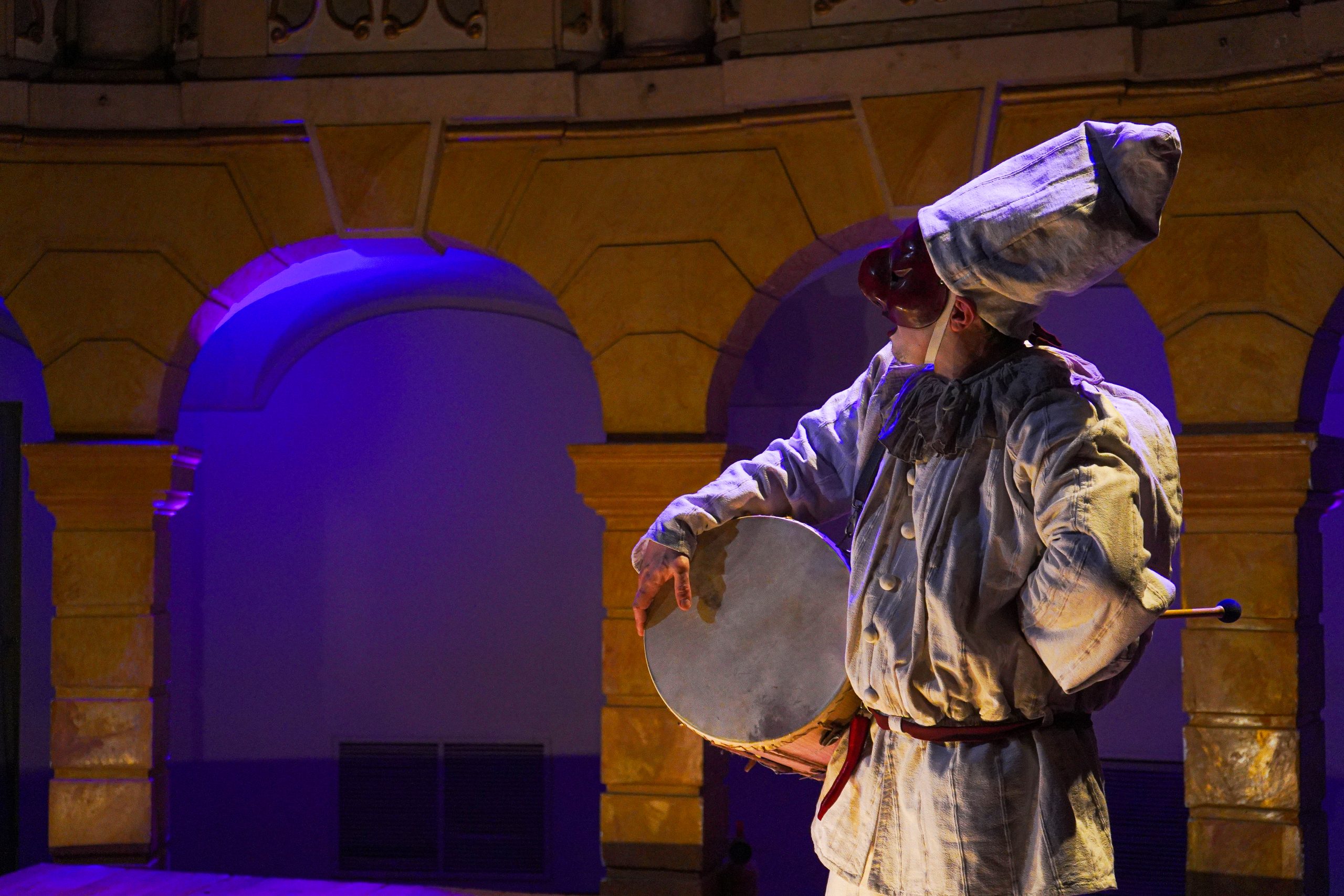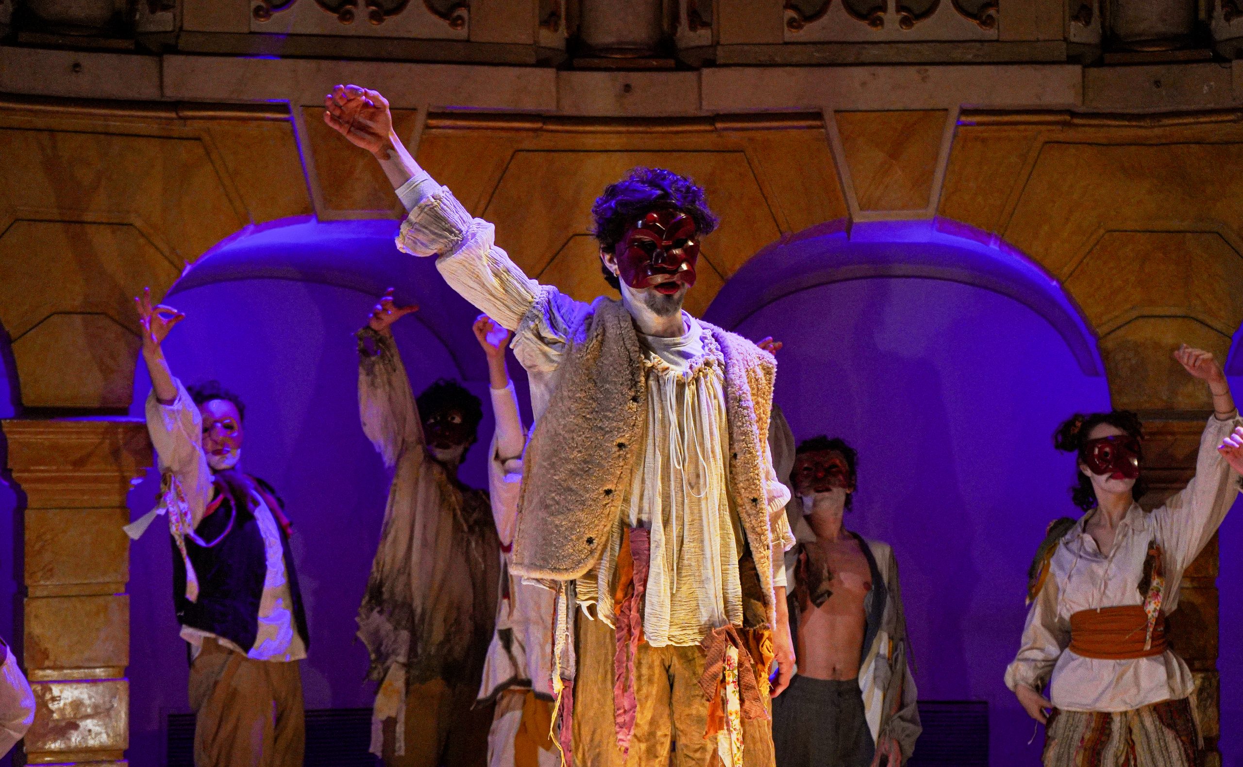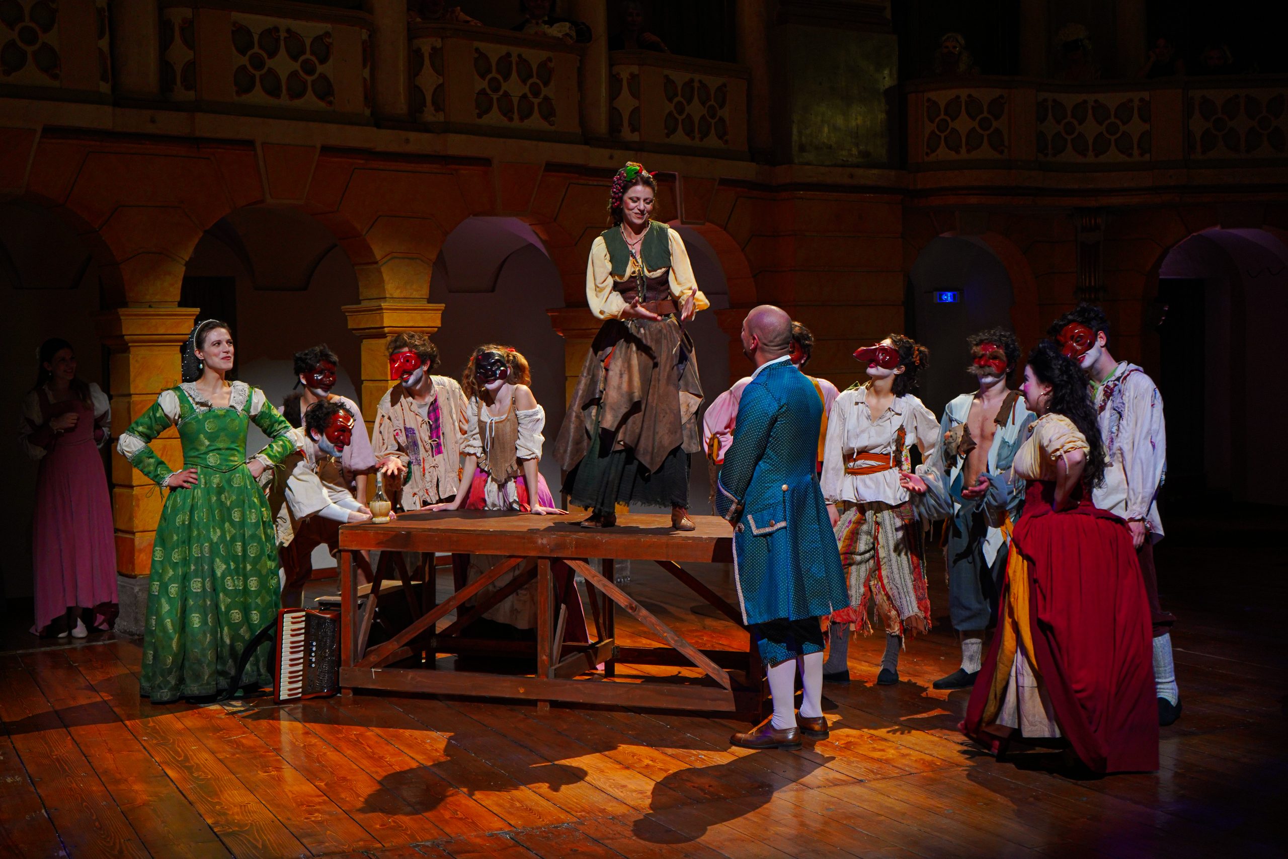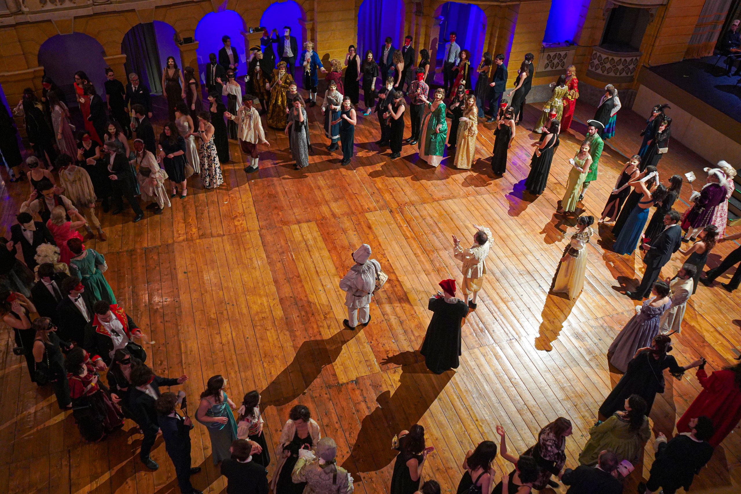 E alla fine Carnevale è stato festeggiato proprio alla maniera di Goldoni. Con le maschere dei guitti, i personaggi della Commedia dell’Arte, la strampalata ed effervescente vitalità di una rappresentazione, nata come omaggio al drammaturgo, che nella serata di martedì 4 marzo si è sviluppata tra il Collegio, le vie del centro e il Fraschini. Gli attori della compagnia Stivalaccio hanno fatto la parte del leone, istruendo sul teatro di strada un gruppo di universitari, ghisleriani soprattutto; la performance finale guidata dall’attore Pierdomenico Simone, un carosello di lazzi, canzoni, musica e danze, ha svegliato la città e l’ha invitata alla festa del Fraschini. Qui, nella platea liberata dalle poltrone e trasformata in un grande spazio, ha preso il via l’evento spettacolare che ha visto, ancora una volta, la straordinaria performance della compagnia Stivalaccio con le maschere della Commedia dell’Arte e le loro scenette, le pantomime, i canti e le danze con il pubblico mascherato e l’accompagnamento musicale delle neonata Orchestra Giovanile Pavese guidata da Giacomo Biagi.