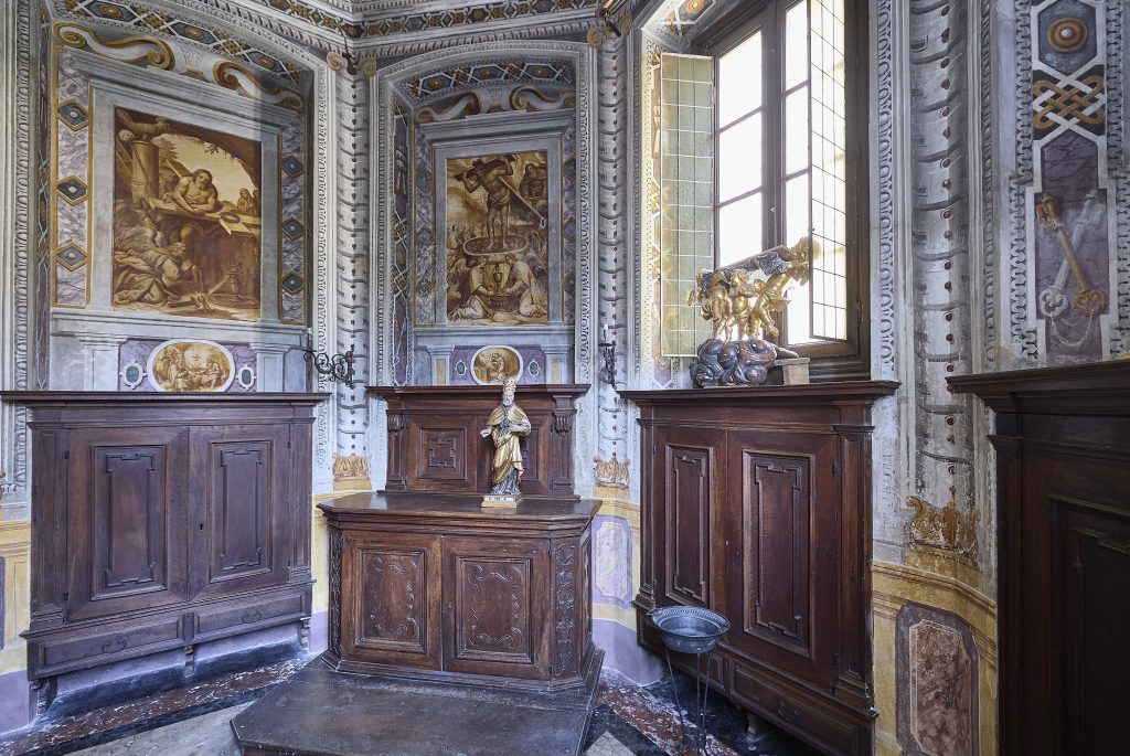 Le ferite di Cristo, provocate da un torchio formato dalla Croce, stillano sangue che si raccoglie in una tinozza. La simbologia del “torchio mistico”, tra le più note forme espressive dell’antica devozione popolare, è subito evidente: così come l’uva torchiata produce il vino che dà forza vitale all’uomo, il sangue del Cristo torchiato ne garantisce la salvezza spirituale. Declinata, nell’arco dei secoli, in fantasiose e raffinate forme d’arte o in manufatti di modesto artigianato, la storia del Cristo nel tino viene raccontata anche da un bell’affresco della Sacrestia del Collegio Ghislieri. Sconosciuto il nome dell’esecutore, è possibile invece risalire sia al committente dell’intero ciclo pittorico che ne decora le pareti, il prefetto del Collegio Giorgio Pagliari (1545 – 1612), sia al periodo della sua esecuzione, certamente antecedente il 1612. Un recente risanamento conservativo curato da Gianpaolo Angelini – docente di Museologia e Storia dell’arte moderna all’Università di Pavia ed ex alunno – e reso possibile dal generoso sostegno economico dell’associazione Amici dei Musei e dei Monumenti Pavesi presieduta dalla ghisleriana Alessandra Ferraresi, ha eliminato umidità e muffe dagli affreschi della zoccolatura restituendo la Sacrestia alle visite degli appassionati d’arte.