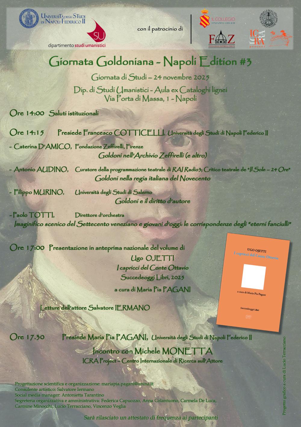 Giunta quest’anno alla sua terza edizione, la Giornata Goldoniana / Napoli Edition curata da Maria Pia Pagani si svolgerà lunedì 24 novembre 2025 nell’aula Ex Cataloghi Lignei del Dipartimento di Studi Umanistici dell’Università Federico II.