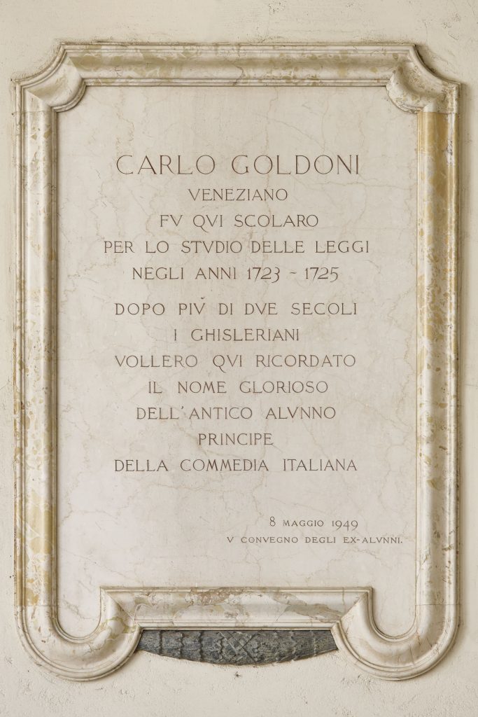Lo svelamento della lapide fu l’evento clou di quello che all’epoca era ancora noto come “Convegno degli ex-Alunni”. Oggi, all’alba dell’anno che segna i tre secoli dall’ingresso di un giovanissimo Goldoni in Ghislieri, il ricordo non può che partire dalla testimonianza tangibile che i suoi stessi compagni di Collegio, quelli che nei secoli successivi hanno abitato le stesse stanze e percorso gli stessi corridoi. Ma perché un omaggio tanto tardivo? All’atto della cerimonia sono trascorsi duecentoventiquattro anni dal momento in cui Goldoni, come da storia che lui stesso rese celebre nei Mémoires, era stato espulso dal Collegio per motivi disciplinari, che avevano a che fare più con l’ostilità della buona borghesia pavese che con le norme interne del Ghislieri.