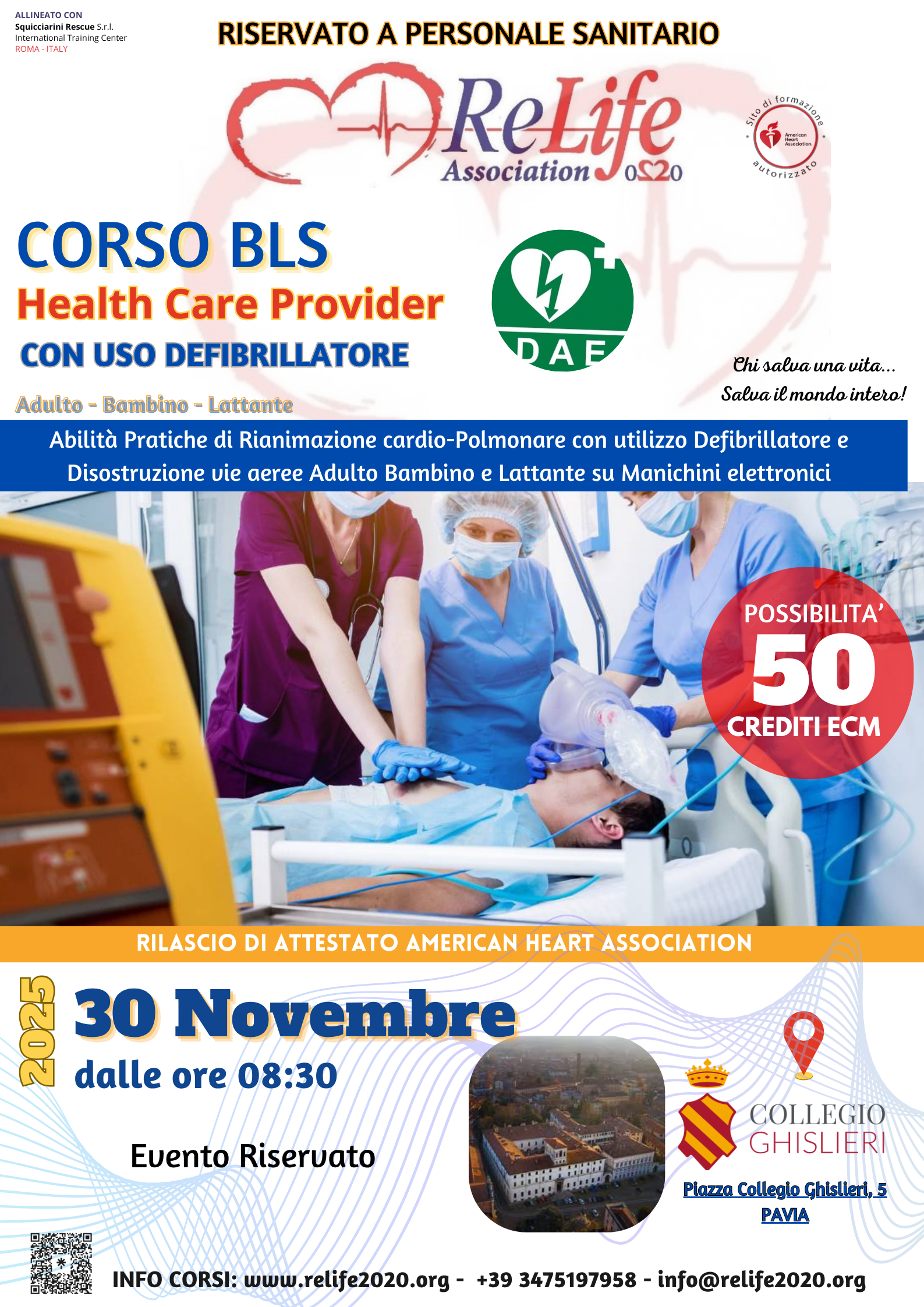 Docenti: dott. Marco Squicciarini, Medico Coordinatore attività BLSD del Ministero della Salute; dott. Valentina Tinelli, ReLife 2020 Association